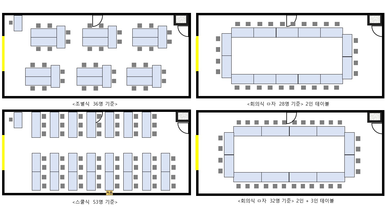 - 회의실 내 외부 음식 반입, 가무 및 음주는 일체 금지하며 불응 시에는 퇴장 조치 될 수 있습니다.